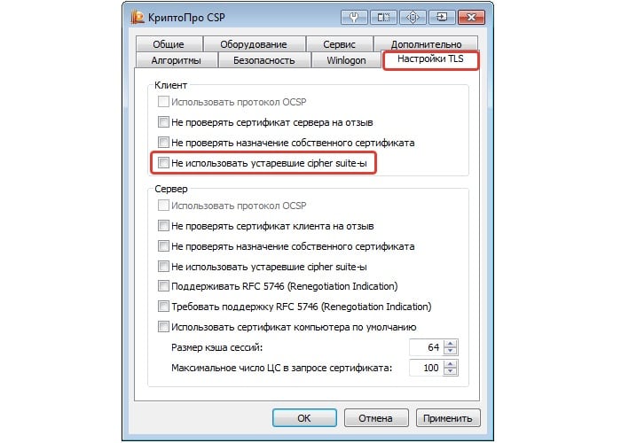 Souvent, une erreur survient non seulement lors de la connexion au serveur d'un bureau privé d'un entrepreneur individuel, mais également au serveur d'un bureau privé d'une personne morale. L'erreur “Vérifier la connexion sécurisée” peut être due aux paramètres CryptoPro. Ici, vous devez accéder à l'onglet «Paramètres TLS» et décocher la case à cocher «Ne pas utiliser une suite de chiffrement obsolète».