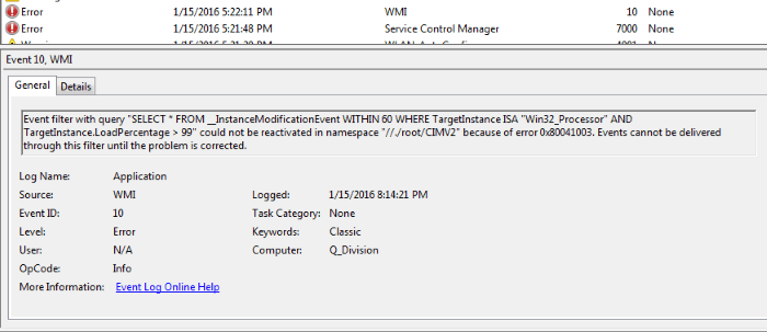 Le système Windows 7 est le plus stable et le plus pratique pour de nombreux utilisateurs aujourd'hui. Les fans continuent de l'utiliser, malgré le fait que 2 nouvelles versions ont déjà été publiées avec de nouvelles fonctionnalités et de nouveaux logiciels. Mais, malheureusement, cet OS n'est pas complet sans échecs. Parfois, les utilisateurs rencontrent le message suivant dans le journal Windows "Win32_Processor" AND TargetInstance.LoadPecentage> 99 "n'a pas pu être réagi dans l'espace de noms." Dans cet article, vous trouverez sa solution.